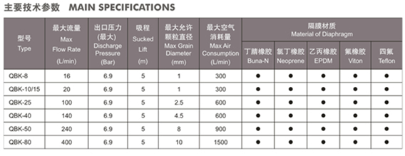 7、QBK氣動隔膜泵使用方便、工作可靠、開停只需簡單地打開和關閉氣體閥門。即使由于意外情況而長時間無介質運行或突然停機泵也不會因此而損壞,一旦超負荷,泵會自動地停機,具有自我保護性能,當負荷恢復正常后,又能自動啟動運行;