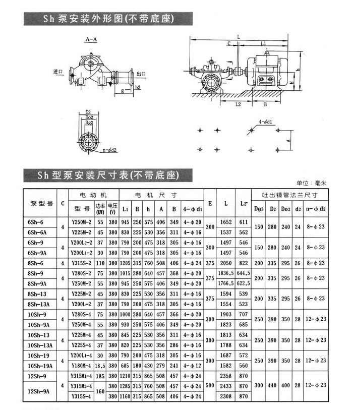 本型泵的吸入口與吐出口均在水泵軸心線的下方,與軸線垂直成水平方向。檢修時(shí)無需拆卸進(jìn)出口水管及電機(jī)。從傳動方向看去,水泵為順時(shí)針方向旋轉(zhuǎn)(根據(jù)用戶需要亦可改為逆時(shí)針方向旋轉(zhuǎn))。