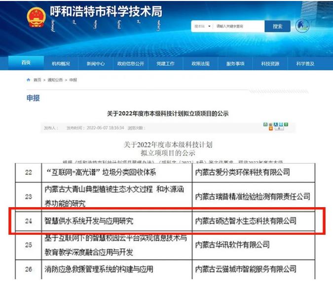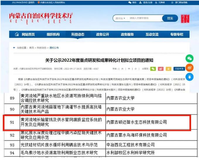 碩達(dá)智水作為水生態(tài)領(lǐng)域高新技術(shù)企業(yè),科研創(chuàng)新是企業(yè)發(fā)展第一驅(qū)動力,公司水生態(tài)研究院一直專注于新技術(shù)、新產(chǎn)品的研究探索。近期,內(nèi)蒙古自治區(qū)科學(xué)技術(shù)廳發(fā)布“關(guān)于公示2022年度重點研發(fā)和成果轉(zhuǎn)化計劃擬立項目的通知”,與呼和浩特市科學(xué)技術(shù)局發(fā)布“關(guān)于2022年度市本級科技計劃擬立項項目的公示”碩達(dá)智水兩大科研項目名列其中。
